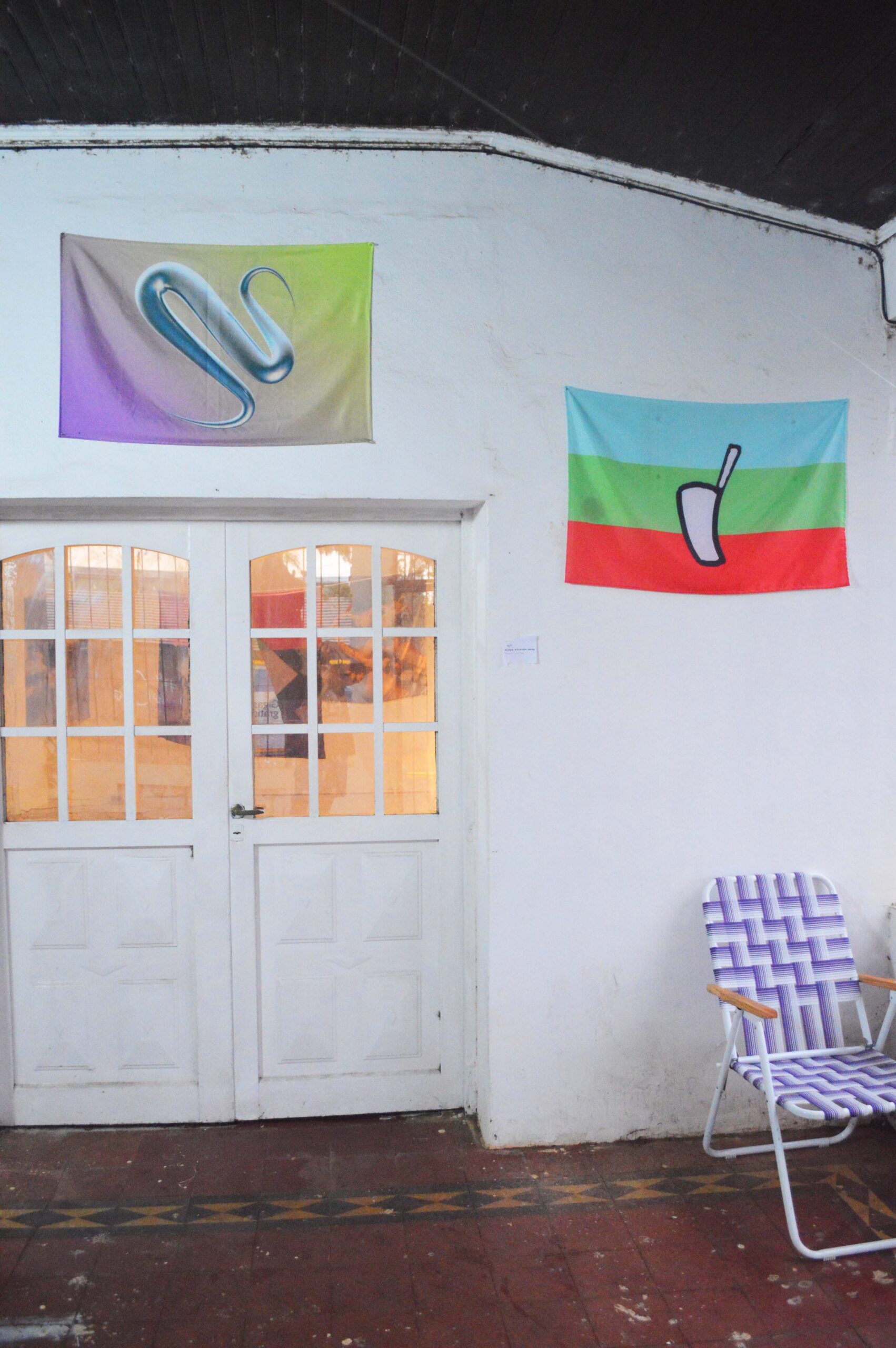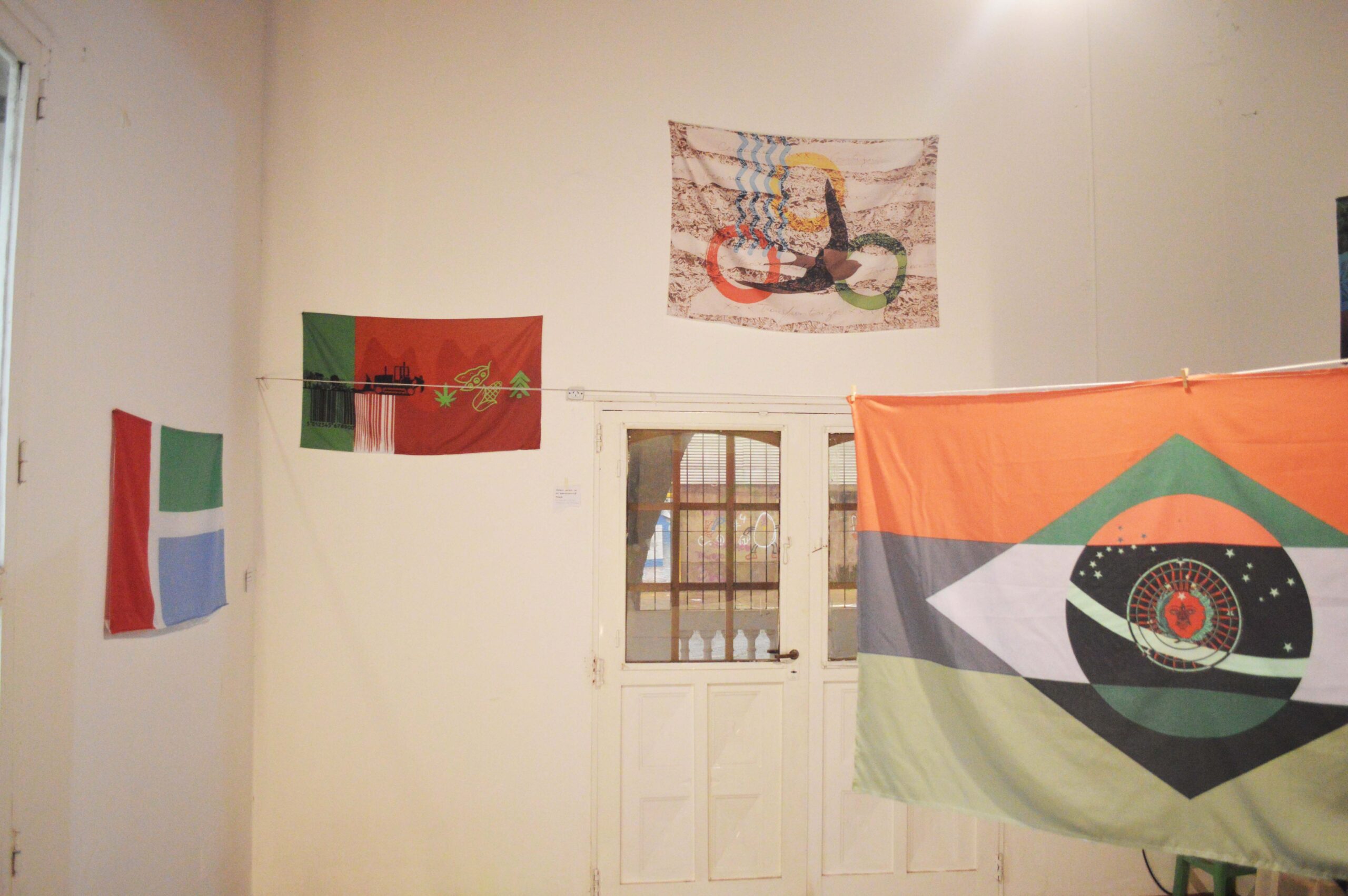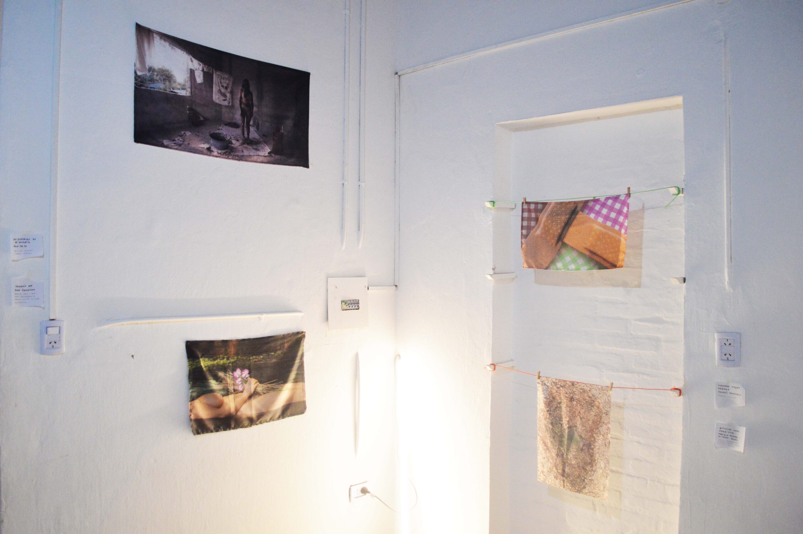 Para vestir una insignia hace falta un cuerpo detrás. Las treinta piezas que flamean en esta muestra visten el traje de bandera para hacer estallar este concepto desde adentro y conspirar en contra de una sola identidad. Nuestra bandera es una drag queen senior e indecisa probándose treinta prendas sin importarle dejar un cuarto desordenado. Mientras, lxs espectadores se transforman en voyeuristas del detrás de escena. Ahora solo tenemos un museo revuelto. Un espejo roto. Treinta fragmentos filosos. Ya no podemos mirar de igual forma a todo lo que hemos destruido pero sí podemos cambiar el eje de nuestra mirada: poner al pasado por delante y el futuro por detrás. Romper la brújula que apunta al Norte y guiarnos por el río Paraná.”