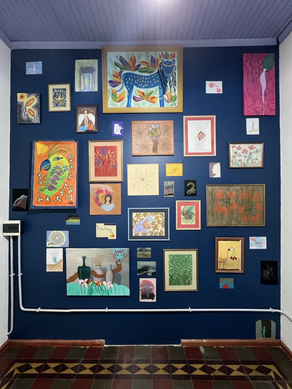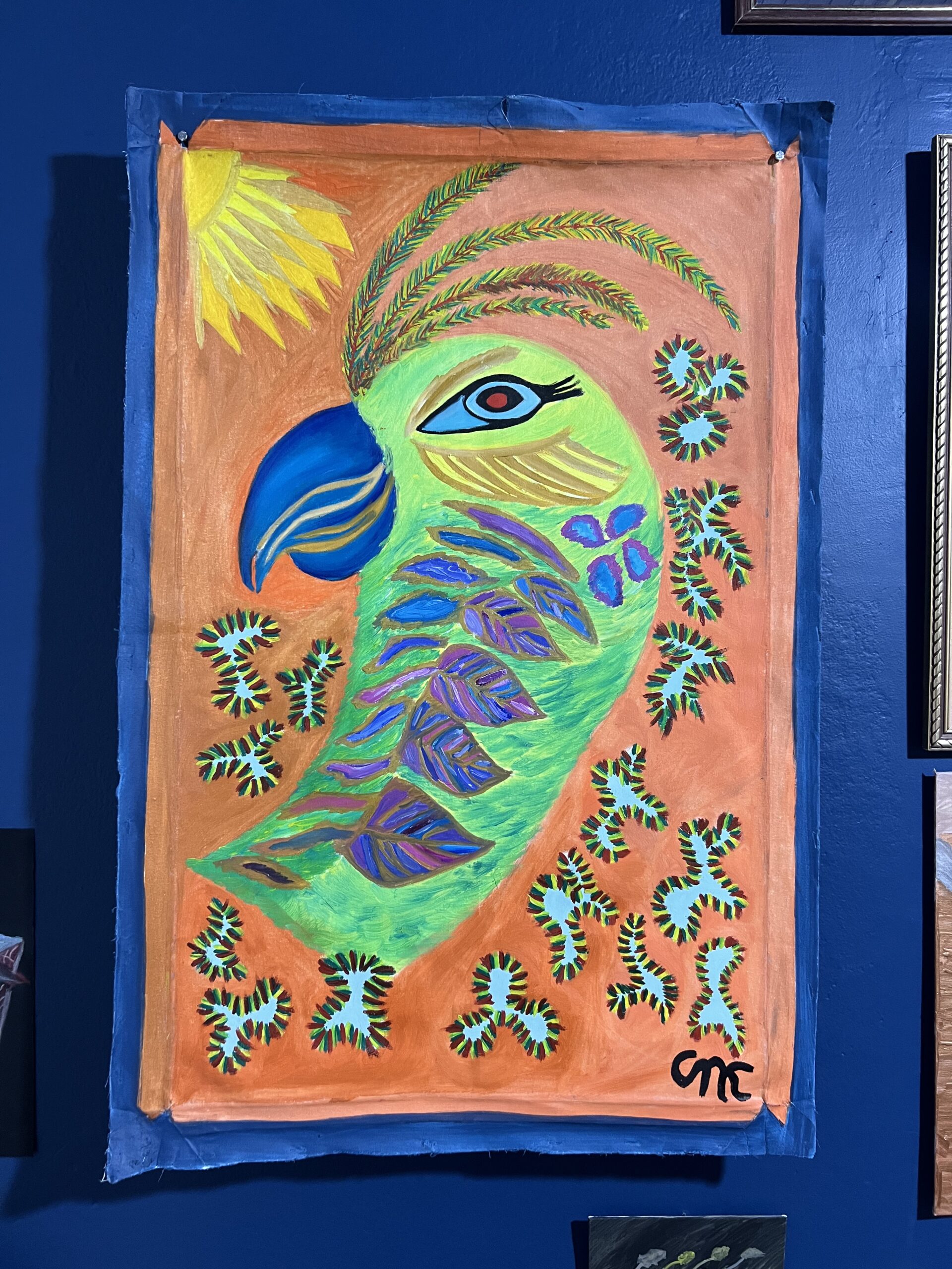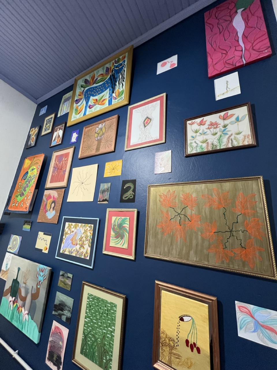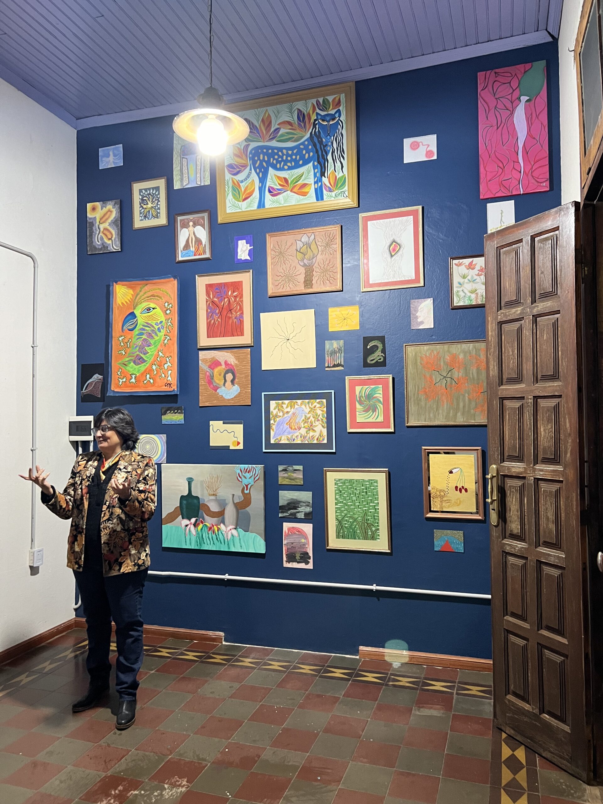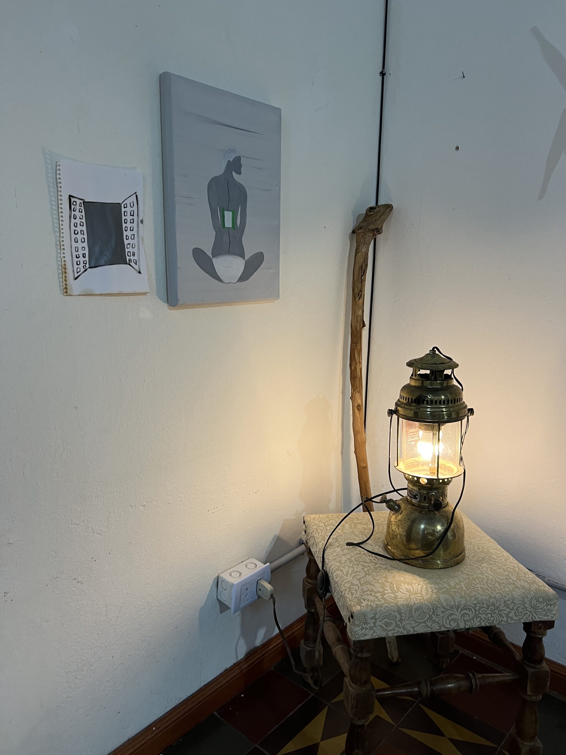 La pintura de Karabyn nace de una necesidad. Insistencia de pintura, el ritual de juntar. La artista se camufla en pinturas que simulan selvas pero son de otro lugar. En muchas pinturas de paisajes misioneros nunca aparecen humanes en el paisaje, como si esta tierra siempre hubiese estado desierta, esa fantasía colonial. Karabyn contamina esa convención tradicional, donde lxs artistas cumplen con un paisaje particular. Inventa máscaras en su mundo Chix’i, donde la pureza del mandato se mancha y aparecen zonas de contacto con lo contradictorio. Pinturas como ritual de exorcismo a un deber ser regional. Libre del peso de la tradición, la mano de la artista se suelta y abre puertas hacia espacios que hasta ahora no tuvieron lugar.