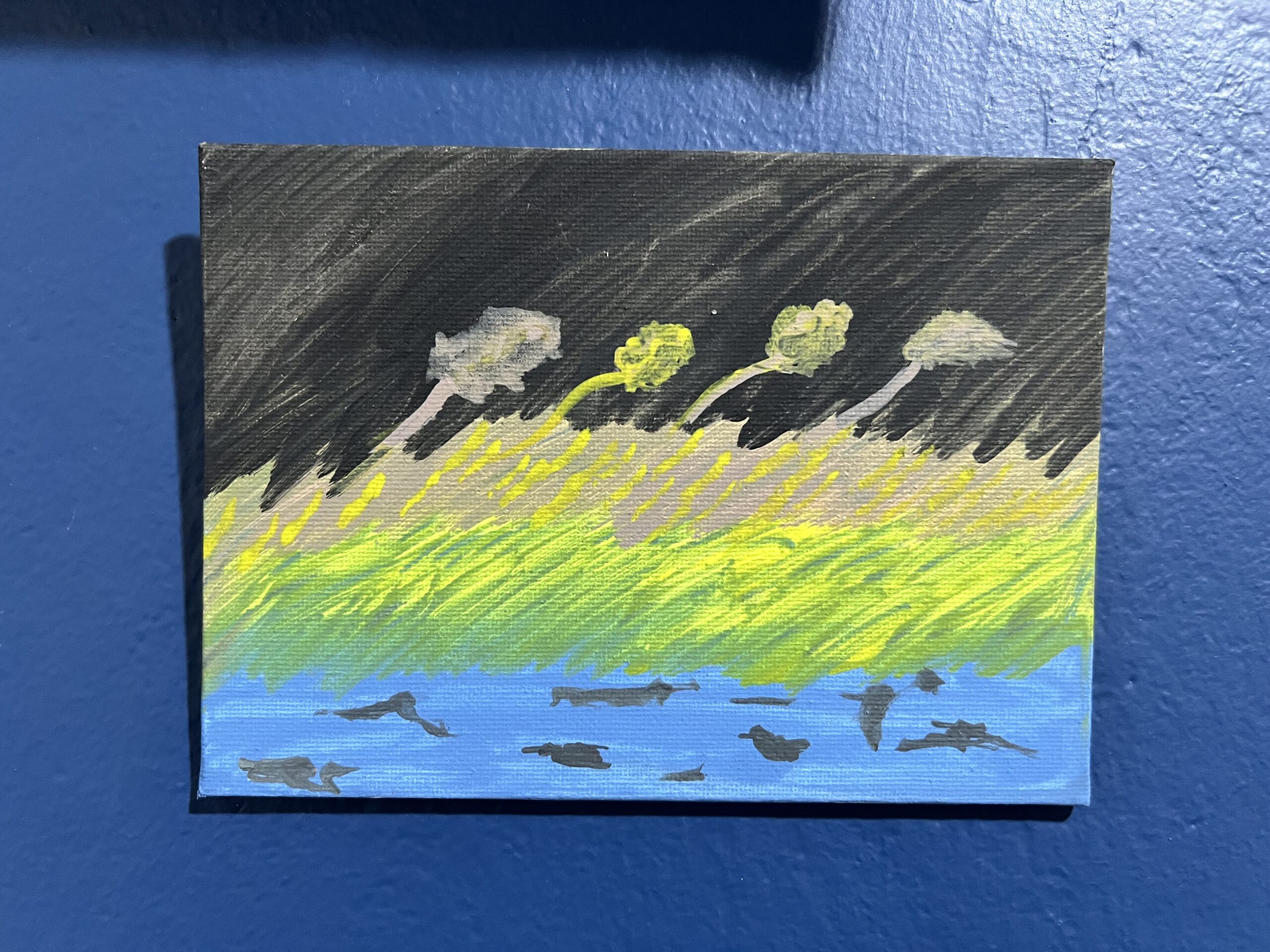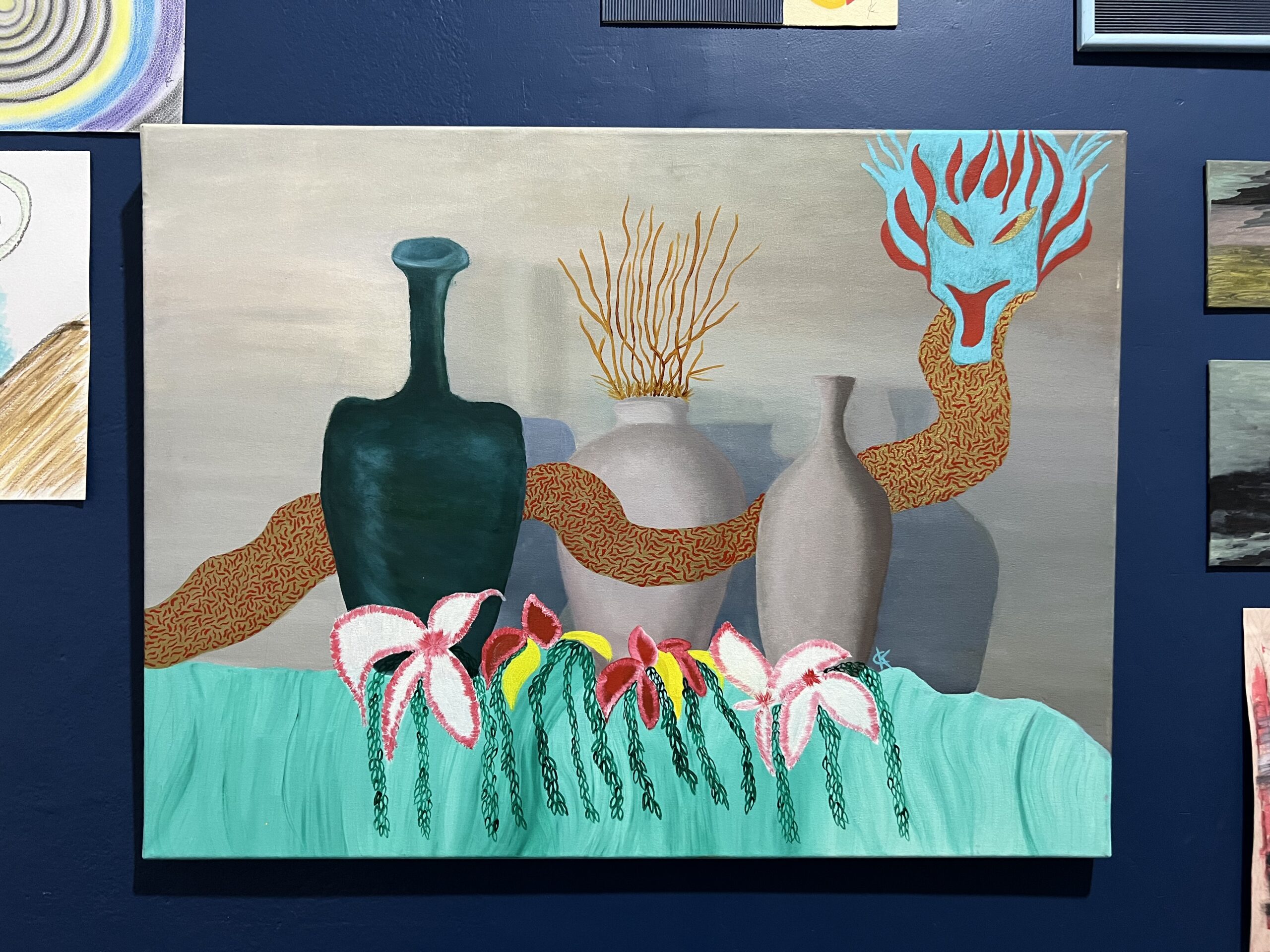 La pintura se escurre de todo intento de encerrarla. Mil veces muerta mira y chorrea por cada grieta que queda descuidada. Una gota cae adentro del jarrón de vidrio que esta entero otra vez. Juntas, la pintura y Claudia se ríen y saben que se volvieron a encontrar.