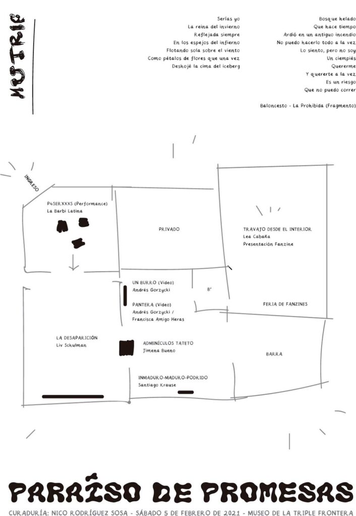 Me gusta imaginar que detrás de los ribetes y metáforas barrocas de La Prohibida, existe alguien que canta para no revelar un secreto, alguien que habla para no estar en silencio, alguien que baila para no pensar de más. Detrás de Paraíso de promesas hay un cuerpo de obras que juega a la embopa escondida como una insistencia política y poética por volver a las fantasías infantiles detrás de los árboles, inventar nuevas mitologías secretas y desviadas e imaginerías tropicales que nos permitan sobrevivir a una realidad de bosques incendiados, luchas territoriales y enfrentamientos fronterizos absurdos. En nuestro paraíso abstracto de promeserxs somos devotxs de una santa que todavía no existe donde las promesas se hacen para atravesar el presente e imaginar que hay un futuro posible, sin importar si se cumplirá.